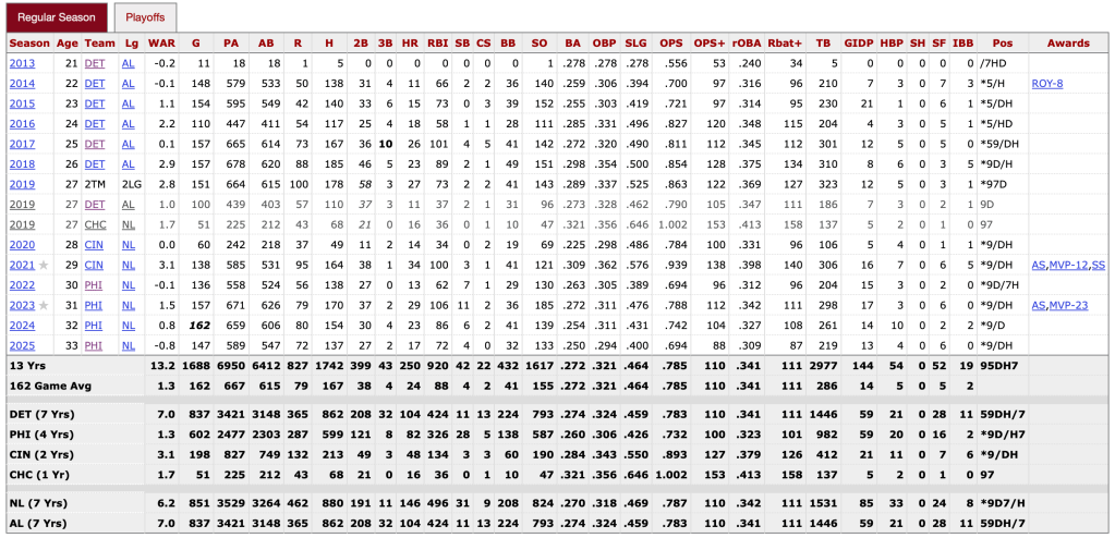 Before we can guesstimate or name potential candidates to land Castellanos, we must first understand the player they’d be receiving. The 2025 campaign for Nick was all but an albatross of a season. Below is the chart of Nick’s batting stats from BaseballReference.com for comparison. And for as poor a season as 2025 was for Nick, the stat line that jumps out even more is comparing the bWAR (Wins Above Replacement) for all of Nick’s time in Philadelphia with his 51 games as a member of the Chicago Cubs in 2019. Across 602 games in Philly, Castellanos has combined for a bWAR of 1.3, and in those 51 games with the Northsiders, a bWAR of 1.7. To say that Castellanos’ time in Philadelphia hasn’t lived up to the expectations would be a wild understatement. So what could be reasonably expected from Nick upon his release is anyone’s guess. But there is still an opportunity to rediscover something with a change of scenery, that maybe unlocks something in Nick that can make him become a positive asset for a team again in 2026. The 2026 season for Castellanos will be just his age-34 season, so it’s fair to believe that there is still more in the tank. Hopefully, moving to another team can reignite that spark for the outfielder.