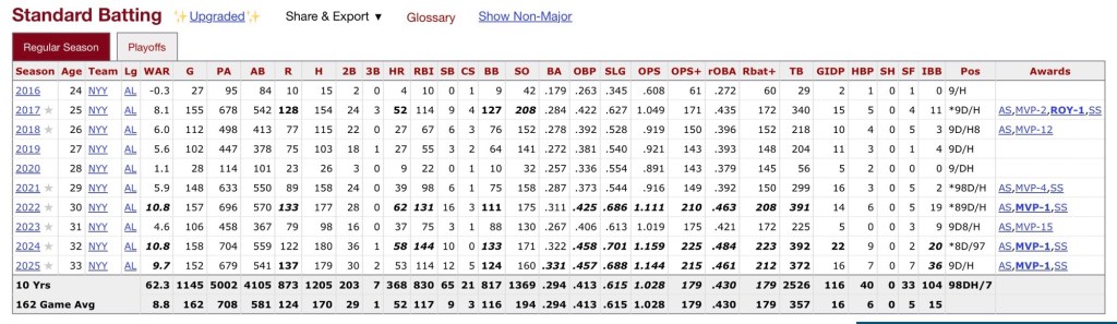 Aaron Judge is the best hitter in all of baseball. (No matter what the Shohei Ohtani stans will say.) Watching Judge step up to the plate is must see tv, there is no walking away from what the Yankee captain is doing in the box. Just look at his OPS+ over his nine full seasons of Aaron’s Major League career, nothing less than being 43 percent better than a league average hitter. (A league average OPS+ is 100; Judge’s lowest outside of his 2016 debut is 143, in 2019 and 2020.)