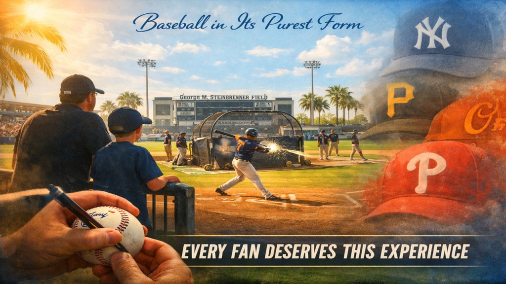 The first time I walked into George M. Steinbrenner Field, I expected something small. Instead, I found myself standing a few feet from my favorite players I’d only ever seen on television, listening to the clearest I’ve ever heard the crack of a bat during batting practice under a bright blue sky and palm trees. There were no towering upper decks or seas of fans. Just baseball, up close and unfiltered.