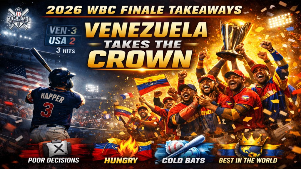 Team Venezuela is the 2026 World Baseball Classic Champions. There’s no doubt that watching his tournament this season, Venezuela was seen as a dark horse in the tournament. The offensive core of the team was a far superior team than they were given credit for by everyone (except Coach Ken Anderson). When watching the way the tournament unfolded and watching the battles with ALL of the best teams in this year’s tournament, there was one team that battled through to the end: Venezuela. Venezuela gave Team Dominican Republic its toughest challenge in pool play. Then Venezuela followed up by dethroning the reigning defending WBC champions in Team Japan. Venezuela would follow that by beating the undefeated Cinderella story of the 2026 WBC in Team Italy. And then ultimately, except for one brief Bryce Harper moment in the bottom of the eighth inning, Venezuela felt in control all night to clinch their first World Baseball Classic Championship.