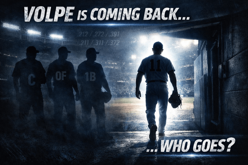 Last night, Anthony Volpe started his rehab assignment in AA (he struck out twice in two at-bats). A hitter cannot be on a rehab assignment for longer than 20 days, so it’s fair to expect Volpe by the start of May. Volpe was not good last year. He had a .212/.272/.391 slash line with 19 HRs and 18 SBs in 539 at-bats. In an odd twist, that is damn close to the Yankees team stats through 17 games, a .211/.311/.372 slash line with 19 HRs and 21 SBs in 544 at-bats. So, if you are upset with the team hitting, it’s because you basically just watched Volpe hit for a full season! Now, with Volpe coming back to the active roster, someone has to go. It won’t be Amed Rosario (.300/.333/.600), who has hit well, and it won’t be Caballero, who is currently starting at shortstop. slashing .179/.220/.286, but he offers position flexibility, and he has 6 stolen bases. That leaves three options, and let’s walk through them.