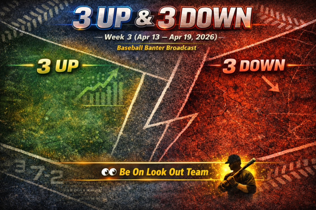 Well, it’s time for the third installment of our weekly countdown series known simply as “3 Up & 3 Down.” So if you’re new to the Baseball Banter Broadcast, 3 Up & 3 Down is our weekly examination of three teams playing well, three teams that aren’t. And we add in a team to “Be On the Look Out” for (or BOLO) just for good measure. So let’s examine “week two” of 3 Up & 3 Down.