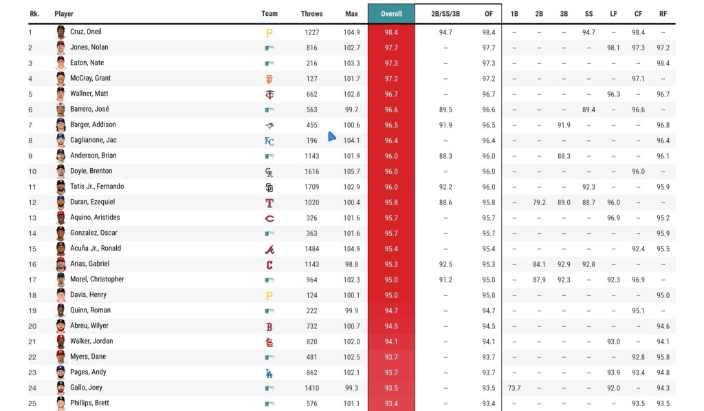 Oneil Cruz is the arm tool, plain and simple. PERIOD! There are few players that even come close to the absolute cannon of a right arm that’s possessed by the Pirates center fielder. While his defense leaves quite a lot to be desired, it’s not for lack of what his arm has the capabilities of doing to help him and the Buccos. Just take a look at this chart below of the StatCast “Arm Strength” (since 2020) and it will tell you just how easily the decision to name Oneil Cruz the arm tool was actually was for the Pittsburgh Pirates.
